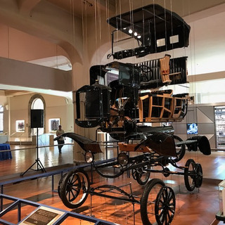 Once of the most interesting displays in the museum is something called an “Exploded Model T”, and the car was listed on the National Record of Historic Vehicles. The car is suspended in mid air, and shows each piece of the car disassembled, and also suspended in mid air. This displays all of the individual parts that made up the model Ford Model T, and how they fit together. It can be best understood by viewing the pictures below. In addition, Lori and I posed for a picture inside of Ford Model T that was assembled and on the ground also pictured below.
