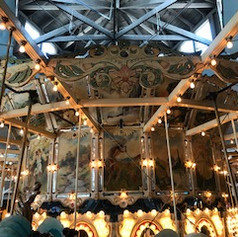 The merry-go-round is impeccably maintained, and the artistry and detail is museum quality! You would never know this carousel has been in use for over a century! Carl offered to give us a ride on the carousel, which I was not expecting! I was just grateful to be able to get in to see it! Typically, merry-go-rounds only have horses, which can get boring after a few rides. The wide variety of animals available on this carousel made it challenging to select which creature to mount! How in the world is one supposed to choose from a: cat, dog, frog, rooster, mule, deer, goat, lion, rabbit, tiger, ostrich, pig, zebra, camel, deer, giraffe, dragon and ample horses? I saw Nate eyeing the giraffe as it is his favorite animal, and I was tempted to hop on the dragon! Seriously, when will I ever again have the opportunity to ride on the back of a dragon? For the first time in our lives, Nate and I opted to be traditional, and rode on horses beside one another! Taking a private ride on a century old antique carousel was one of the most romantic and memorable experiences on my cross country trip. Please see the pictures below of America’s oldest original carousel in continuous use!